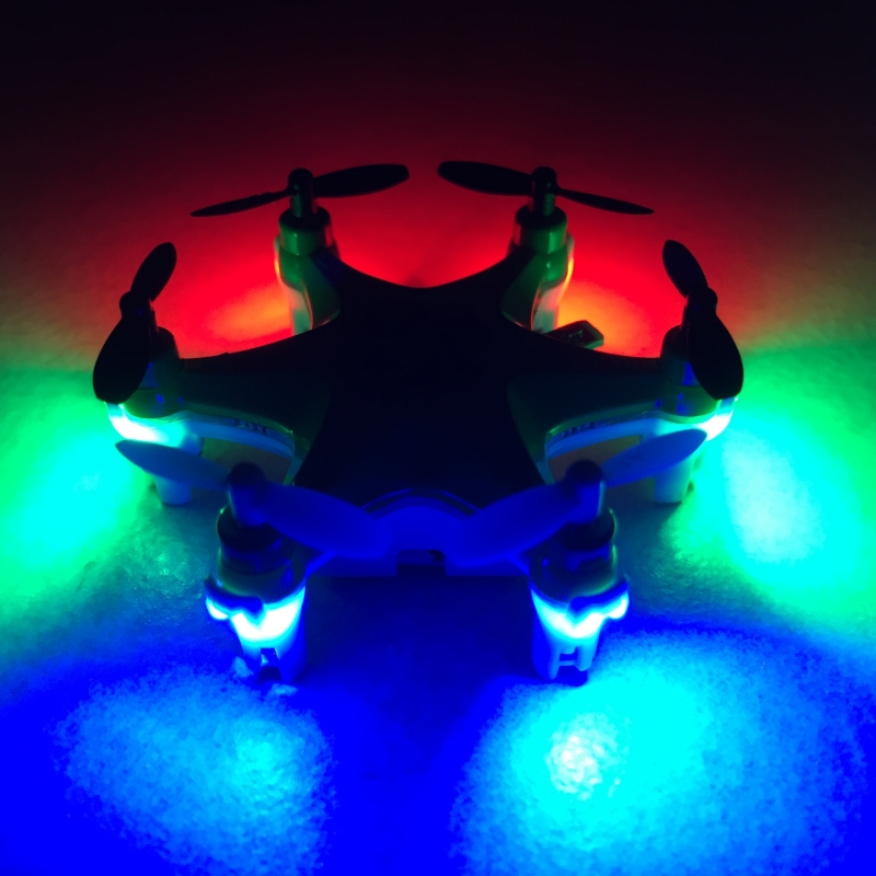 Ein Druck auf die «oben» Taste vom linken Steuerkreuz aktiviert den «Headless-Mode». In diesem Modus fliegt der Copter immer in diese Richtung, in die ihr den Stick richtet. Unabhängig von der Lage des Copters.